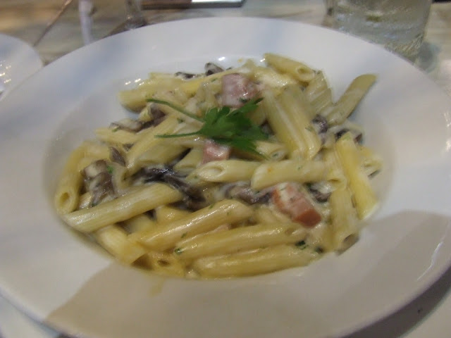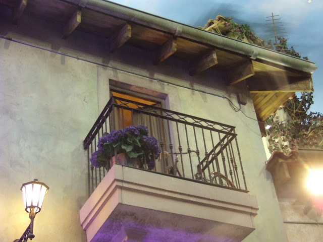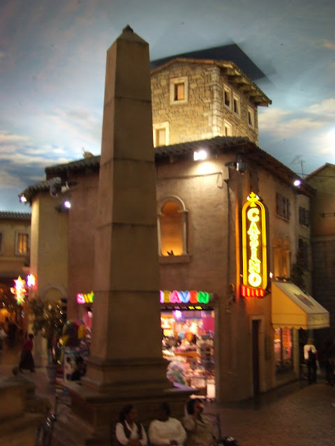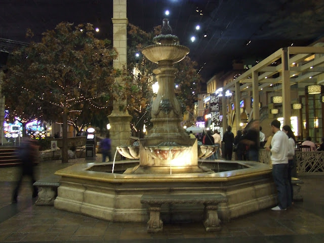 The exterior is grand, with echoes of an Italian castle, but once inside, past the stringent security checks, the decor is breathtaking. Set up like an Italian village, the shopfronts and street cafes are quaint, right down to the flowers trailing from the ornamental balconies, bedecked with Tuscan-style window shutters, and the washing lines crossing the street way above visitors heads. The ceiling resembles the sky very realistically, so that once you are ensconced in the hubbub, you can forget that you are inside. We requested an outside table at the restaurant, before realising that even "outside" was inside.