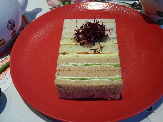 Our first course arrives, a selection of savouries consisting of two sandwiches each, a brioche roll and a mini quiche. The sandwiches and roll are fine, nothing standout, and the quiche is a warm, tasty mouthful, but highlight of this course are the cheese scones served with bacon jam. We're disappointed that the food hasn't arrived on the traditional tiered stand, but when the next course arrives, the reason for this becomes clear.