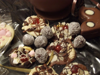 Today's mouthwatering picture of the day is the selection of chocolate goodies I made at an Easter chocolate workshop at Temper Temper in Southborough. A combination of truffles, florentines, lollies, moulds and chocolate bowls made for a yummy morning.