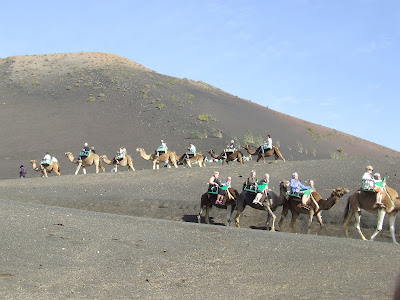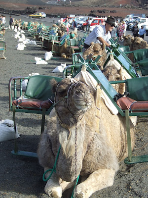 We later found out that the camels - all 400+ of them - live in the nearby village of Yaiza. While nobody is allowed to walk in the National Park, an exception is made for the camels and their handlers, for whom a special path has been carved out in the volcanic material. The walk to work takes them two hours everyday - although on the way home it only takes an hour and a half, because the camels are hungry by this time and keen to get home for their dinner. Seriously.